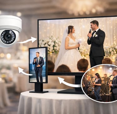 خدمة تأجير شاشات مع كاميرات تتيح لك نقل الحدث مباشرة من أرض الواقع إلى شاشة كبيرة أمام الحضور سواء كان حفل زفاف أو ملكة أو مؤتمر أو ندوة أو فعالية مدرسية أو احتفال تخرج أو بطولة رياضية أو افتتاح محل أو معرض تجاري، حيث نقوم بتركيب الكاميرات في مواقع مدروسة داخل المكان ثم ربطها بالشاشات لعرض المشهد المباشر بشكل احترافي، مما يمنح الضيوف تجربة مشاهدة أوضح خصوصًا في القاعات الكبيرة أو الأماكن المفتوحة التي يصعب فيها رؤية التفاصيل من الخلف.